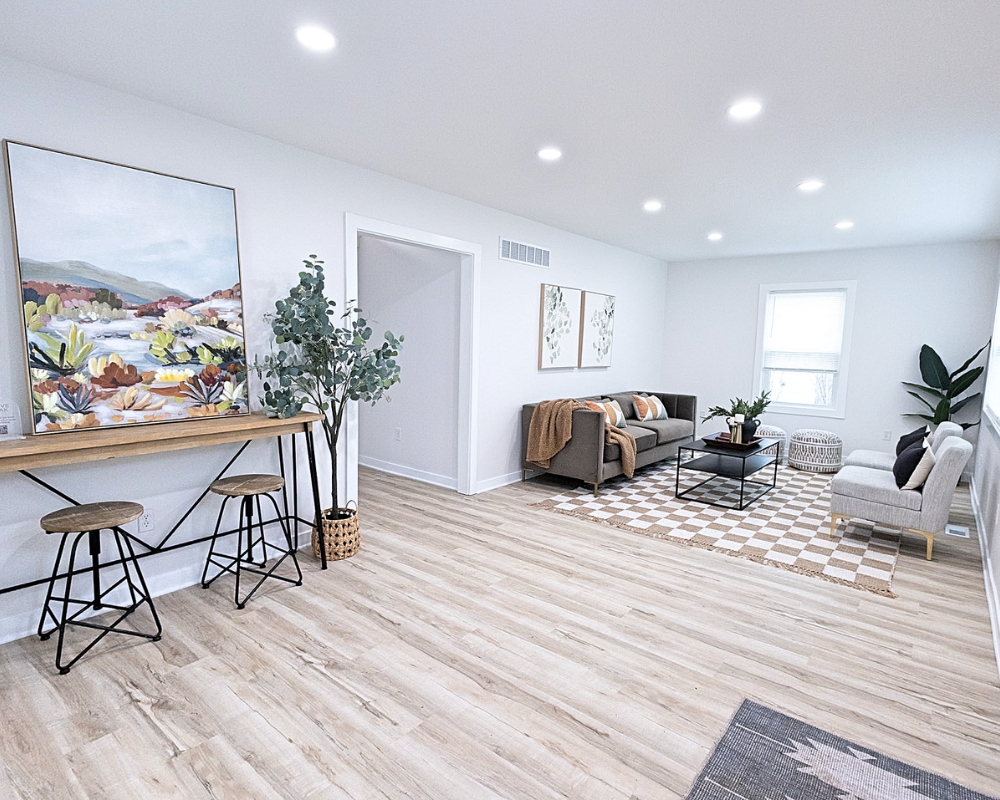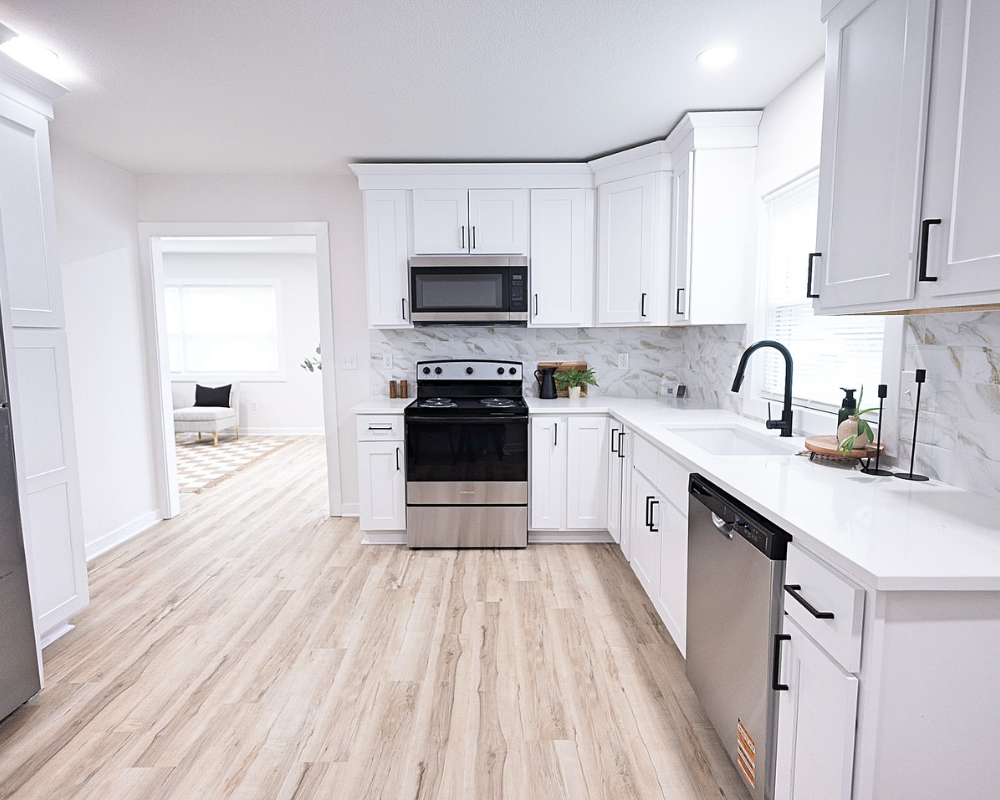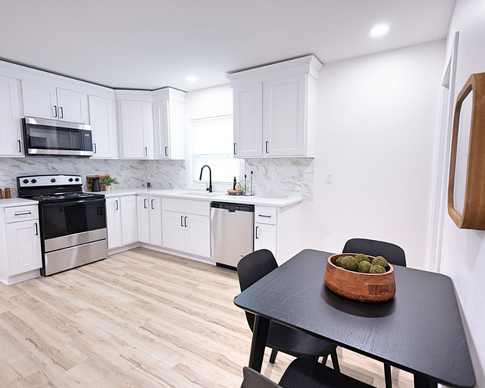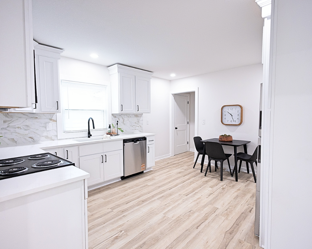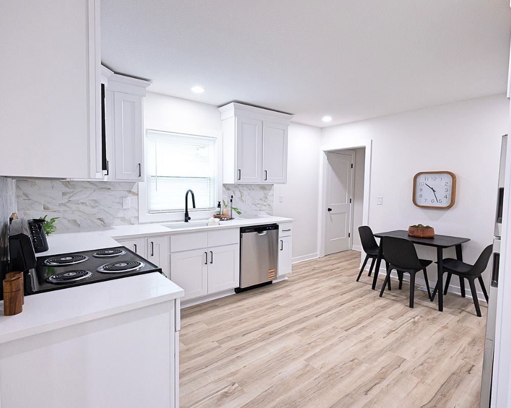 This full home renovation transformed the interior into a bright, cohesive, and modern living space. Light wood flooring flows throughout the home, creating continuity while enhancing the natural light in every room. The kitchen was redesigned with clean white cabinetry, sleek hardware, and a marble-inspired backsplash that brings a fresh and timeless feel to the space. Open living areas now feel more spacious and welcoming, with a layout that allows each space to flow naturally into the next. The bedrooms were updated with simple, calming finishes that create a comfortable and restful atmosphere. Altogether, the renovation gives the entire home a clean, contemporary look that feels both inviting and functional for everyday living