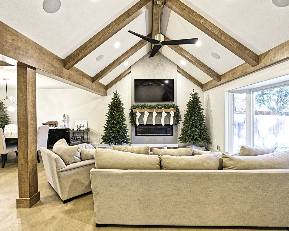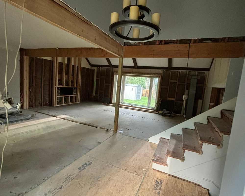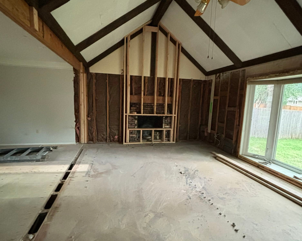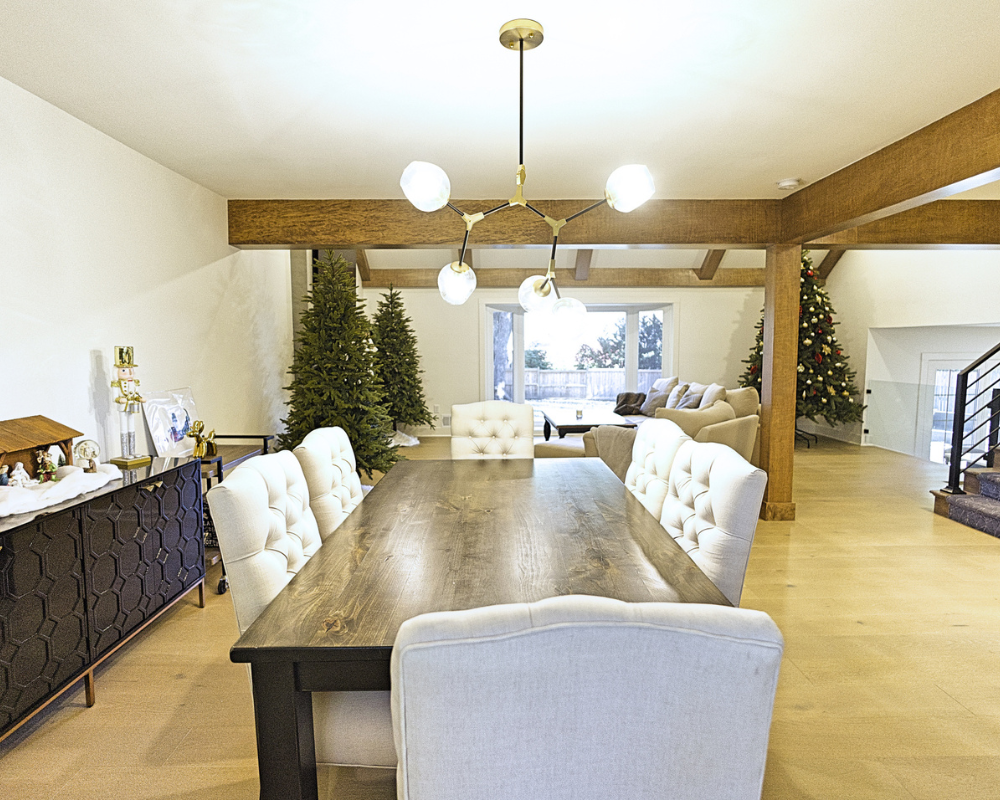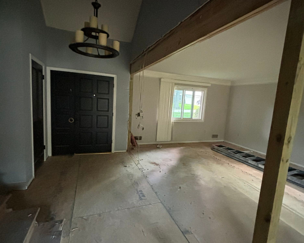 This full home renovation completely transformed a dated, compartmentalized layout into a bright, open, and beautifully refined living space. The new vaulted living room showcases warm wood beams, a sleek fireplace feature wall, and expansive windows that fill the home with natural light. The kitchen was reimagined with custom cabinetry, high-end appliances, and a clean, timeless palette that brings both elegance and functionality. Every detail—from the bold wallpapered powder room to the luxurious bar lounge and the spa-inspired primary bathroom—was thoughtfully designed to elevate the homeowners’ everyday experience. With cohesive finishes, modern lighting, and intentionally curated spaces, the home now feels contemporary, inviting, and truly tailored to the family’s lifestyle.
