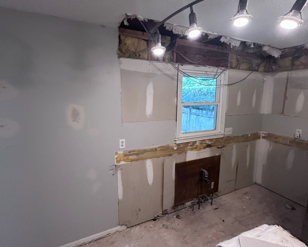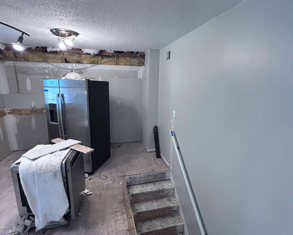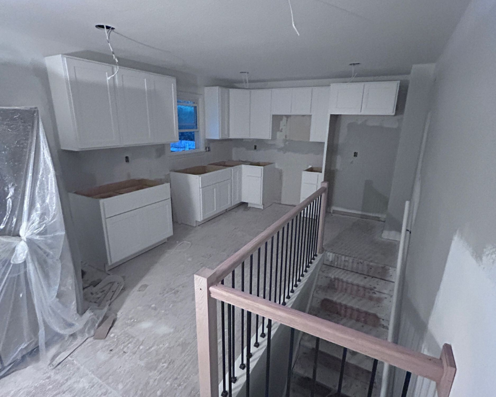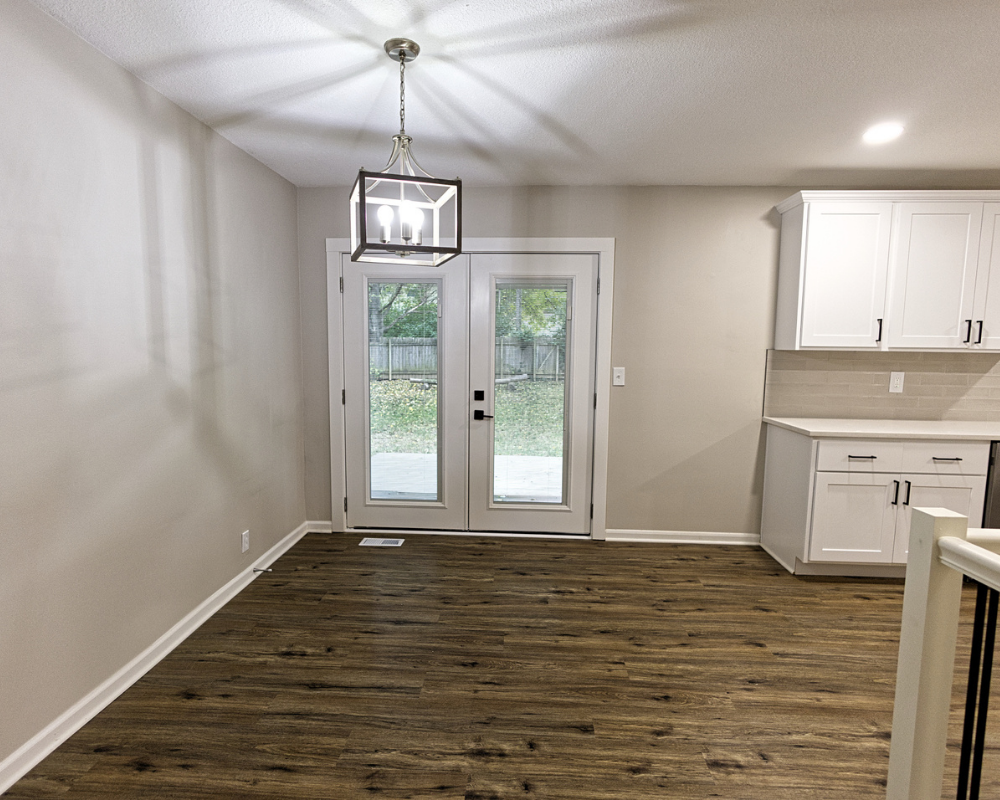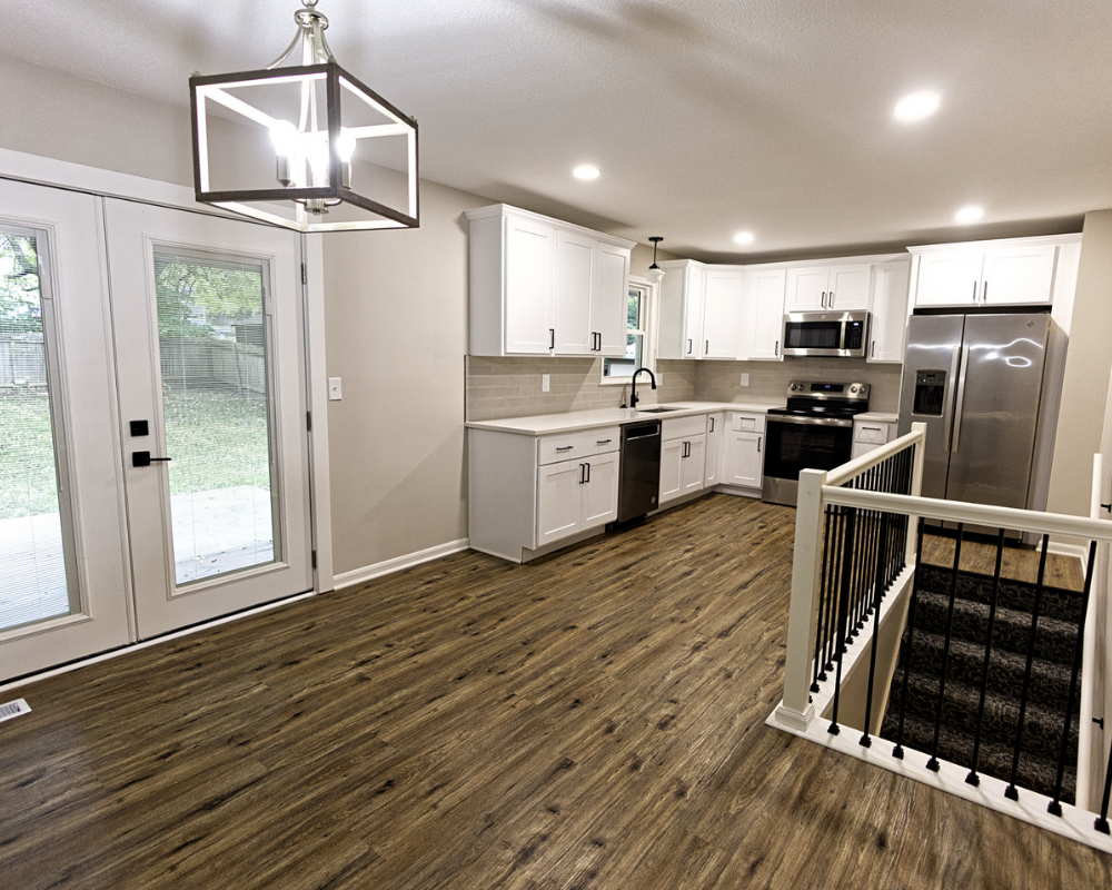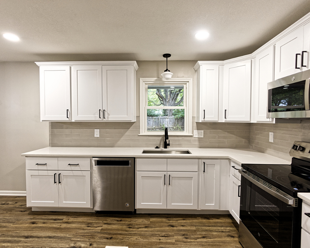 This kitchen underwent a complete transformation, turning a dark, stripped-down space into a bright and functional centerpiece of the home. New white shaker cabinets instantly lifted the room, paired with sleek quartz countertops and a soft gray tiled backsplash for a clean, modern look. The updated layout maximizes storage and workflow, while stainless steel appliances complement the fresh design. Warm wood-look flooring adds contrast and brings a welcoming feel to the entire area. A new pendant light and recessed ceiling lighting brighten the space beautifully, enhancing the open flow toward the dining area. The finished result is a spacious, contemporary kitchen that feels both elegant and inviting.