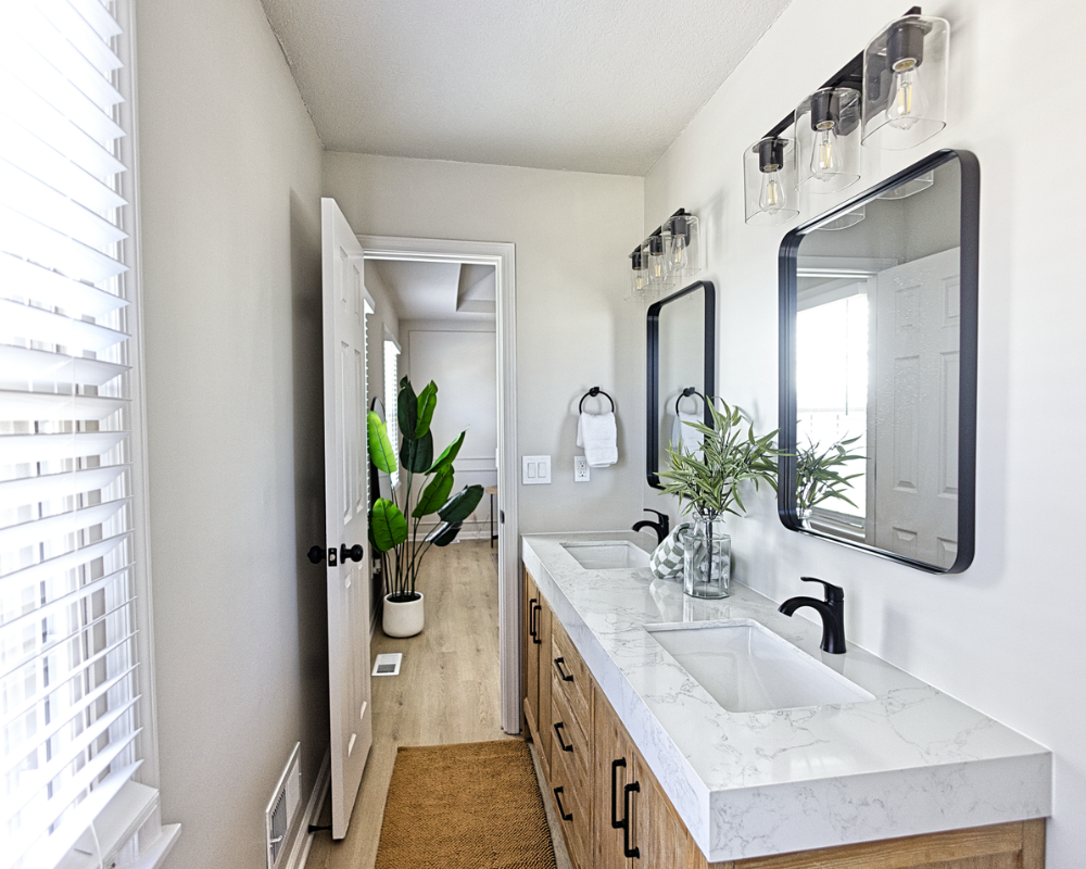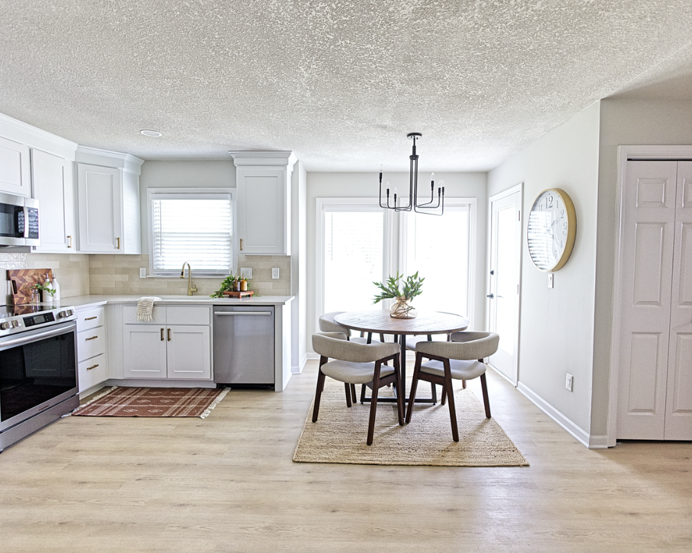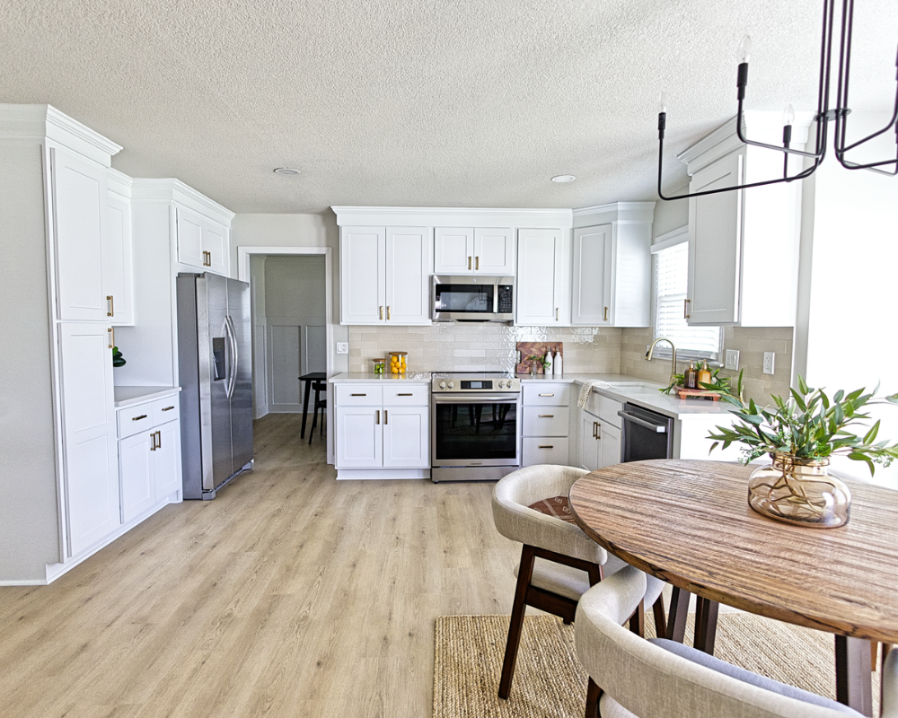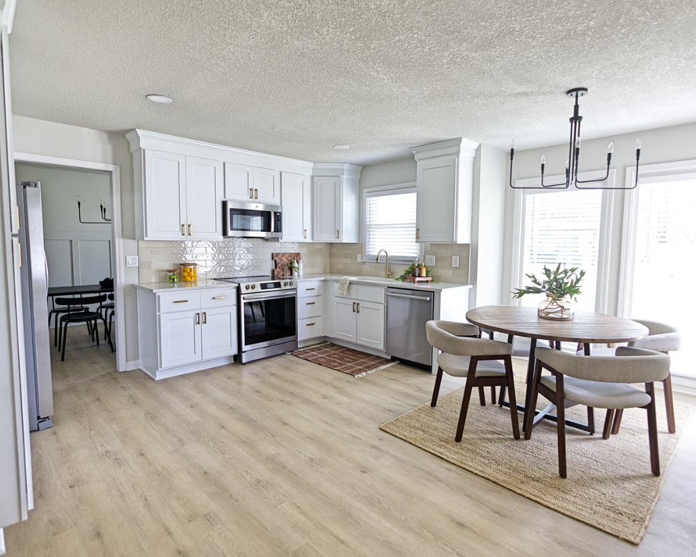 This full home renovation transformed the interior into a bright, cohesive, and modern living environment designed for both comfort and functionality. The updated kitchen features clean white cabinetry, warm brass hardware, and a soft neutral backsplash that brings a timeless and elegant feel to the space. Light wood flooring runs throughout the home, creating continuity while enhancing the natural light across the living areas and bedrooms. The bathrooms were refreshed with modern vanities, clean tile work, and updated fixtures that add both style and practicality. Open and welcoming living spaces now flow naturally into the dining and kitchen areas, making the home feel more spacious and connected. Altogether, the renovation gives the entire home a fresh, contemporary look that feels warm, polished, and ready for everyday living.