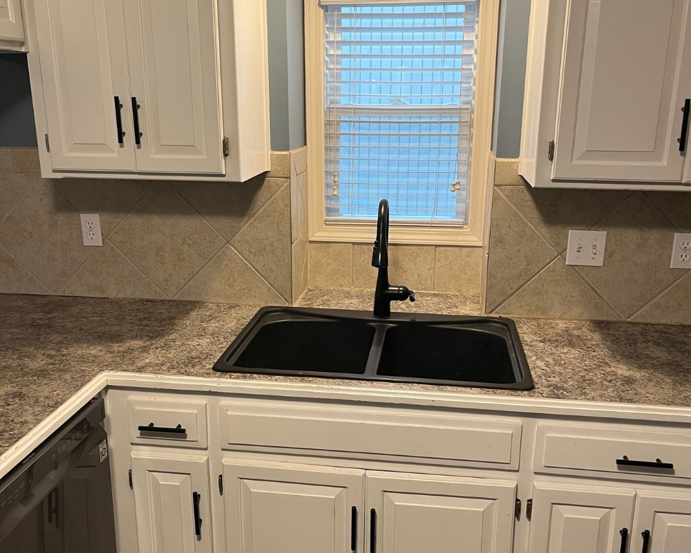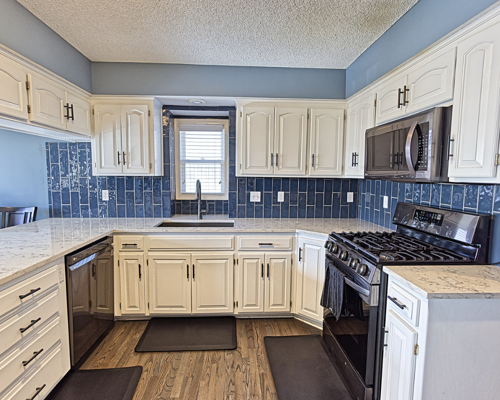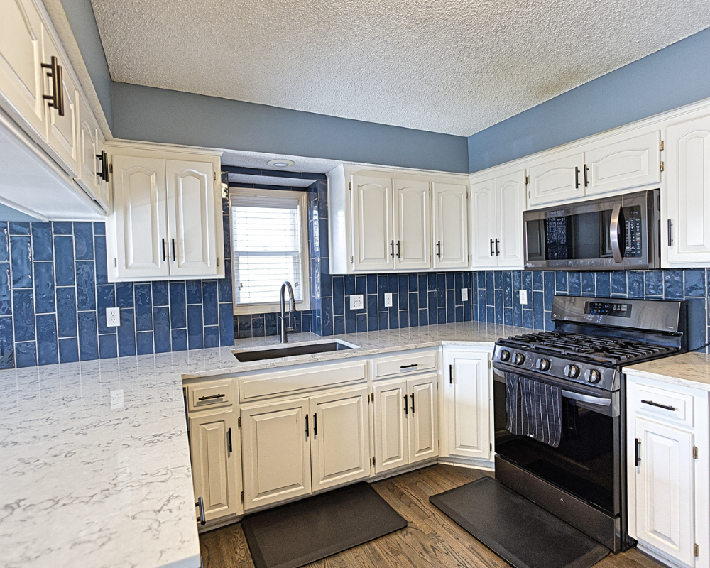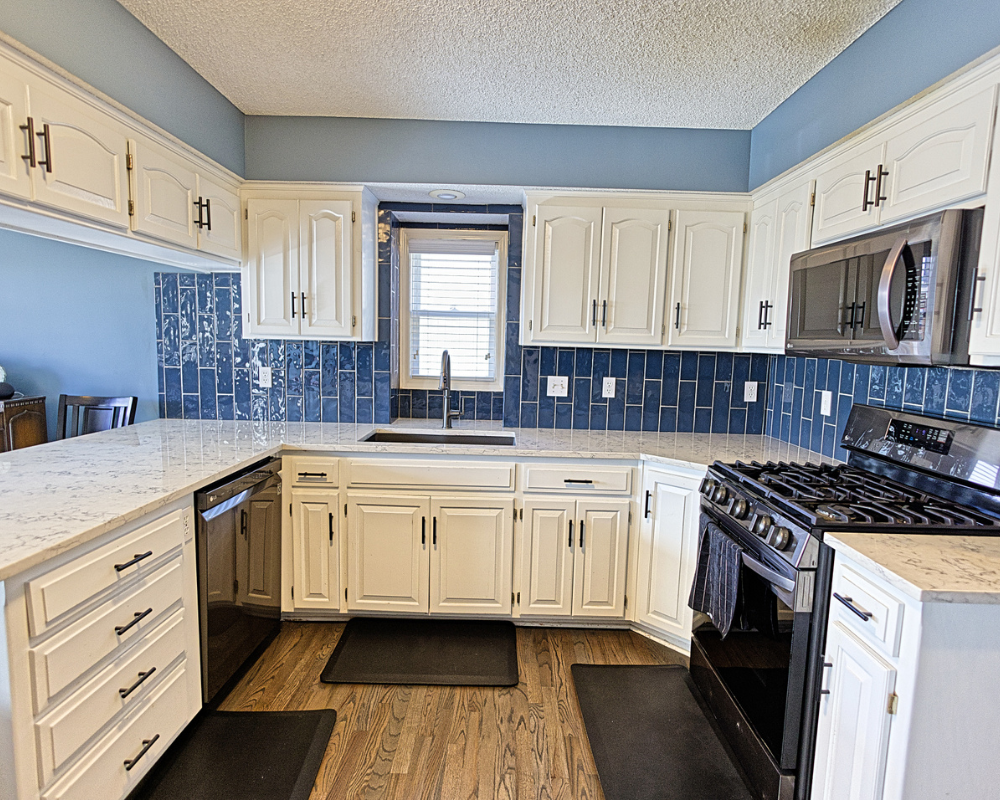 This kitchen now feels brighter, more open, and visually balanced, with a clean layout that highlights its classic charm. The light cabinetry paired with rich blue accents creates a fresh contrast that adds depth without overwhelming the space. Natural light from the window enhances the overall warmth and makes the kitchen feel welcoming throughout the day. The finishes and details work together to give the room a more refined and cohesive look. With its updated appearance, the kitchen feels more functional and inviting for everyday use.