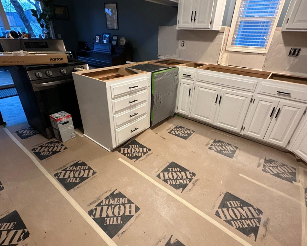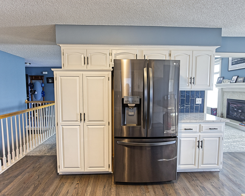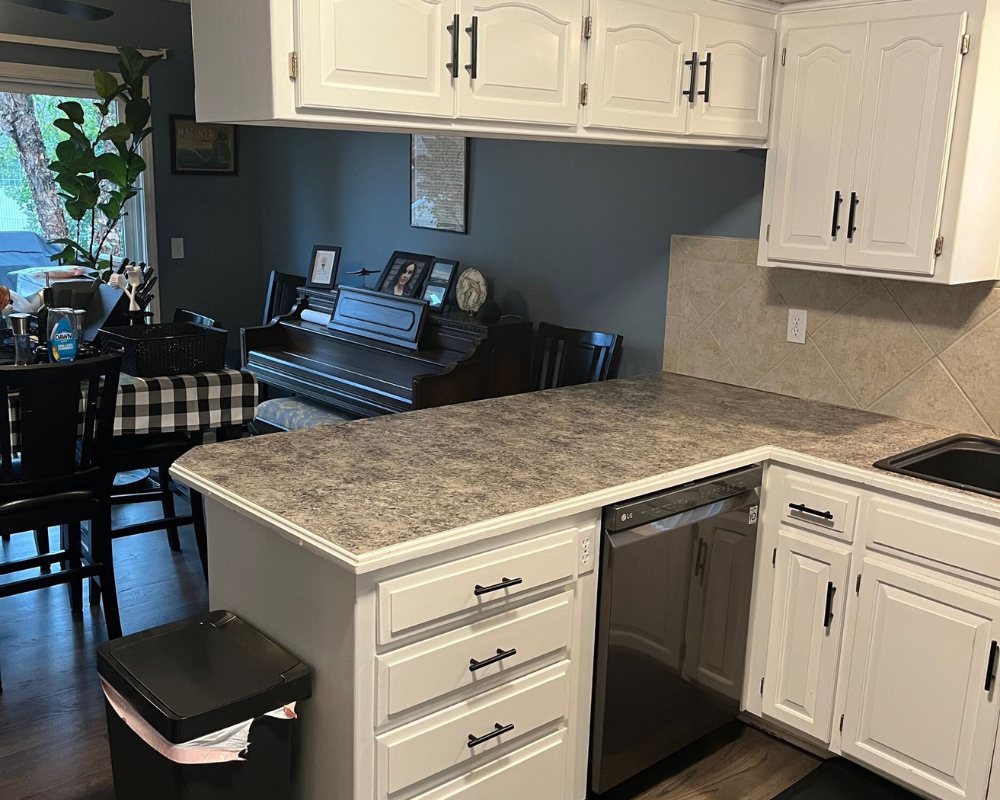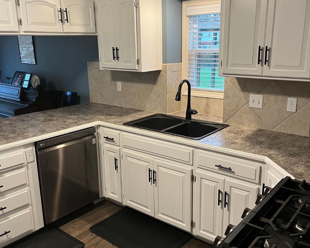 This kitchen now feels brighter, more open, and visually balanced, with a clean layout that highlights its classic charm. The light cabinetry paired with rich blue accents creates a fresh contrast that adds depth without overwhelming the space. Natural light from the window enhances the overall warmth and makes the kitchen feel welcoming throughout the day. The finishes and details work together to give the room a more refined and cohesive look. With its updated appearance, the kitchen feels more functional and inviting for everyday use.