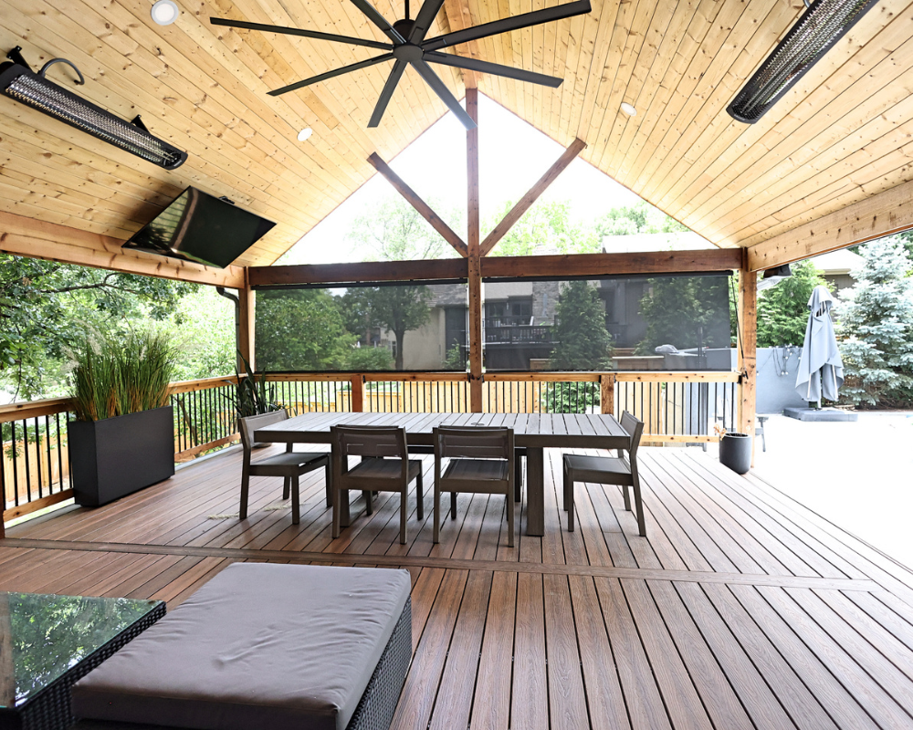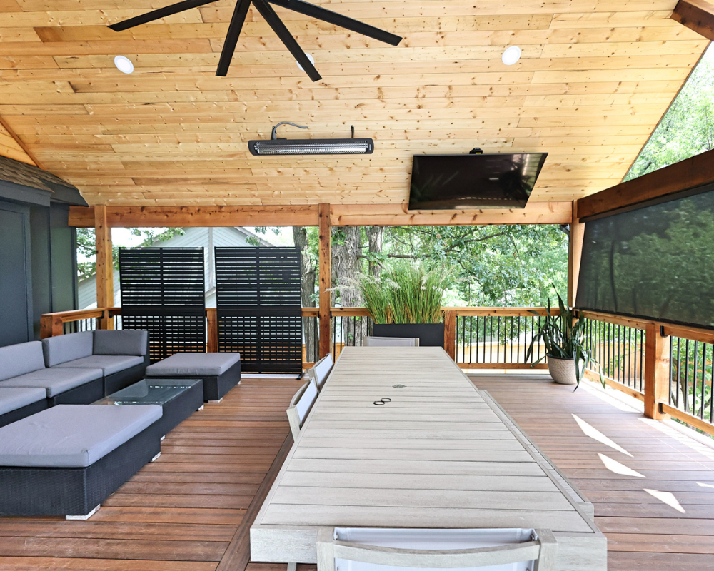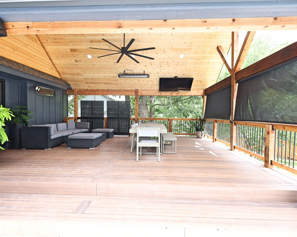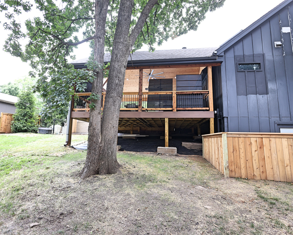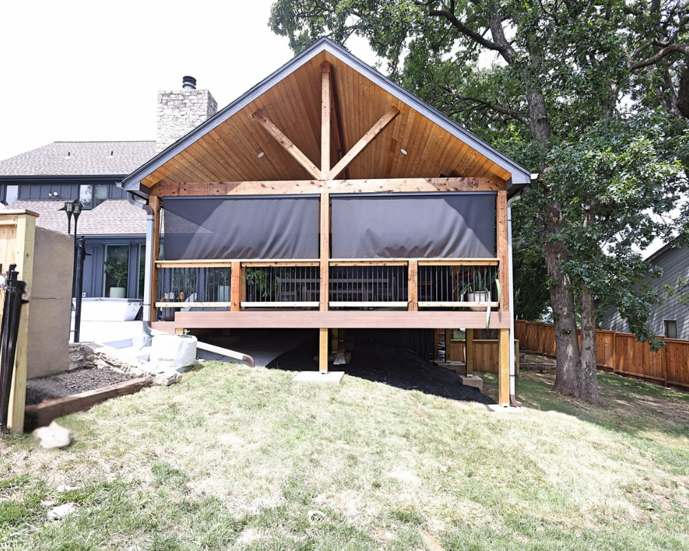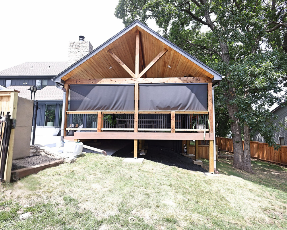 This dramatic deck transformation turned an uneven, underused slope into a stunning covered retreat perfect for year-round enjoyment. What began as a snowy hillside and rough terrain evolved into a spacious outdoor living area, complete with natural wood tones, a vaulted ceiling, and custom railing. The new structure features integrated lighting, a modern ceiling fan, retractable screens, and space for both dining and lounging—ideal for entertaining or quiet moments surrounded by nature. Thoughtfully built to complement the existing home, the deck blends rustic charm with modern convenience. Now, it’s not just a backyard—it’s a destination.