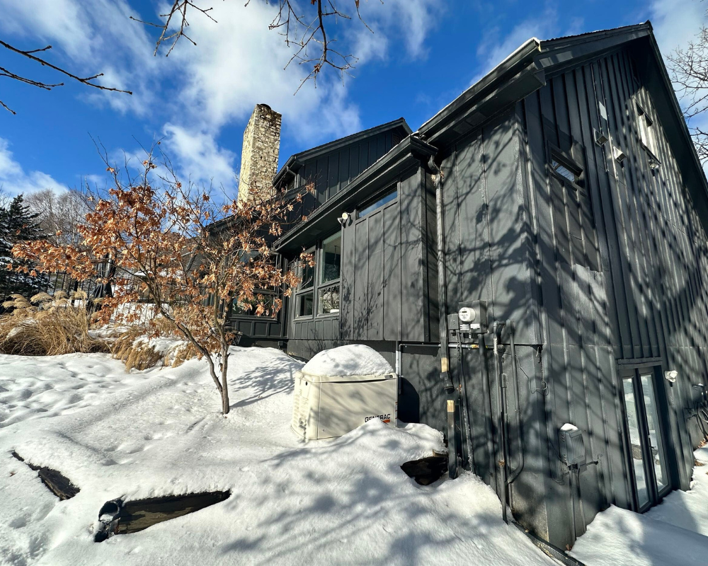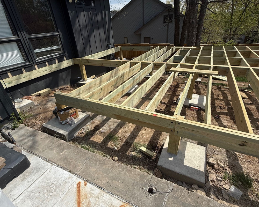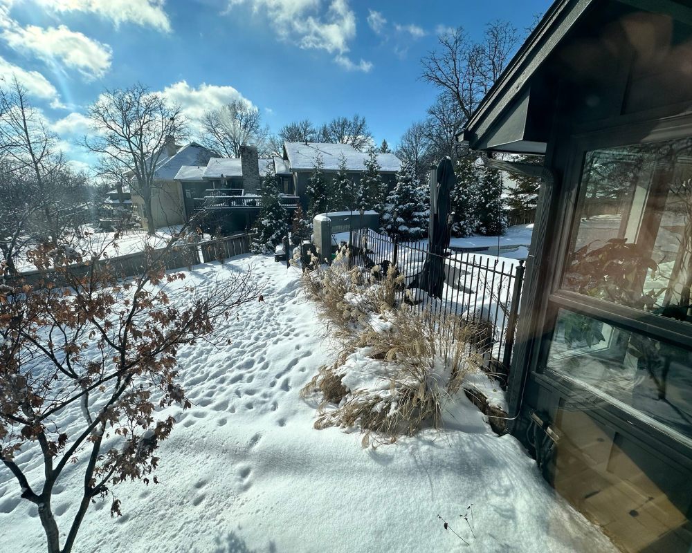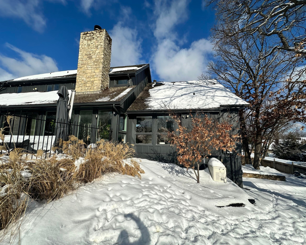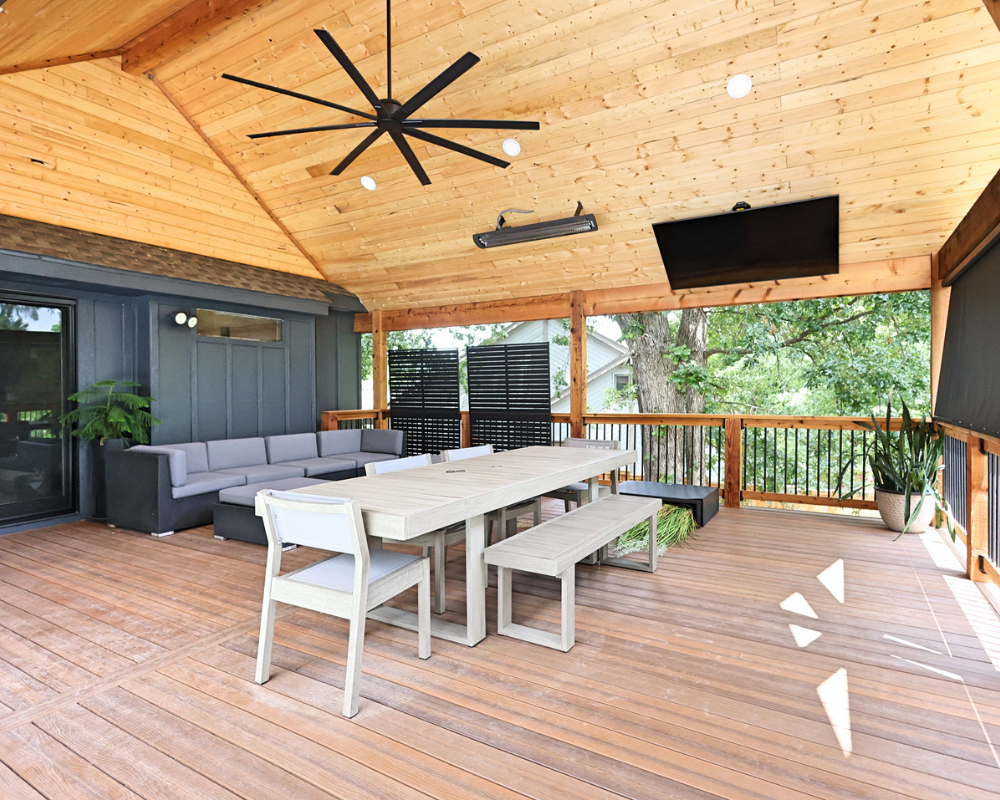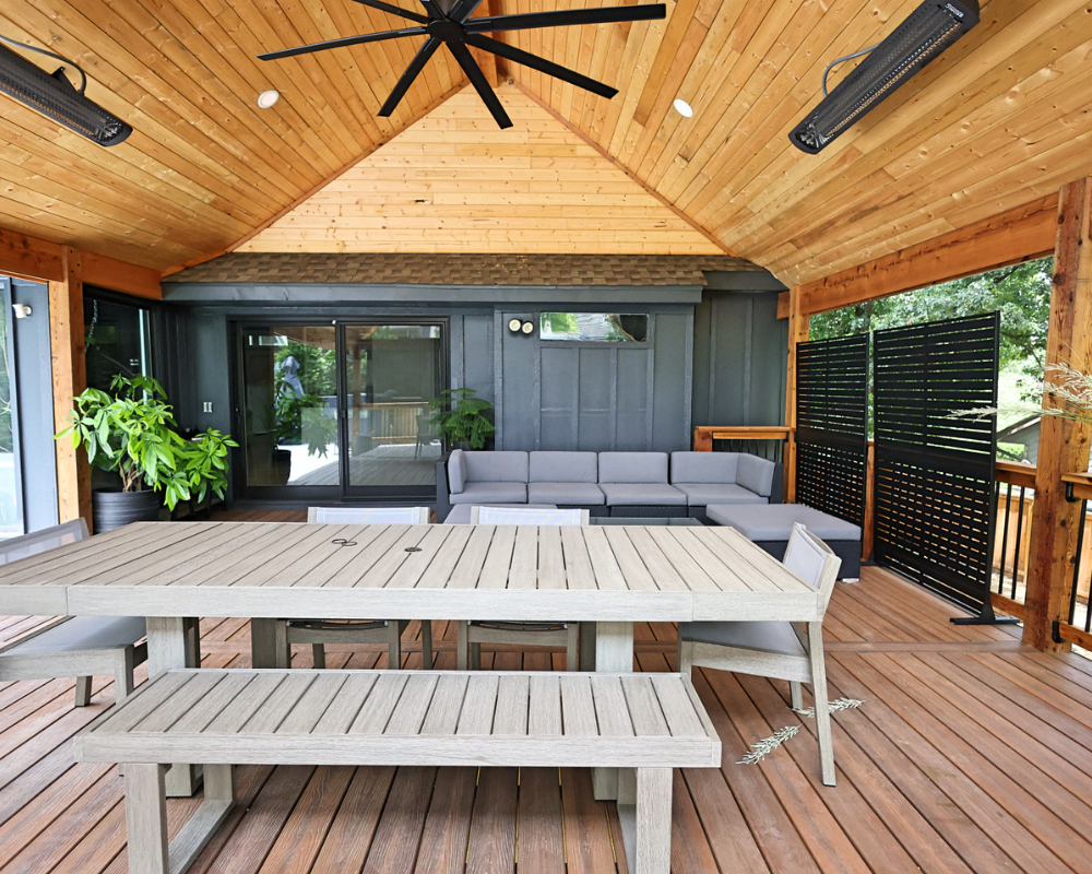 This dramatic deck transformation turned an uneven, underused slope into a stunning covered retreat perfect for year-round enjoyment. What began as a snowy hillside and rough terrain evolved into a spacious outdoor living area, complete with natural wood tones, a vaulted ceiling, and custom railing. The new structure features integrated lighting, a modern ceiling fan, retractable screens, and space for both dining and lounging—ideal for entertaining or quiet moments surrounded by nature. Thoughtfully built to complement the existing home, the deck blends rustic charm with modern convenience. Now, it’s not just a backyard—it’s a destination.