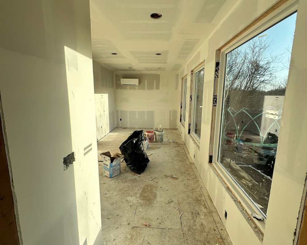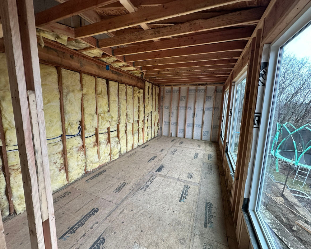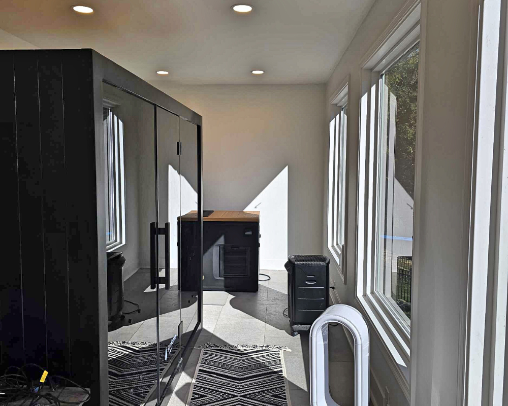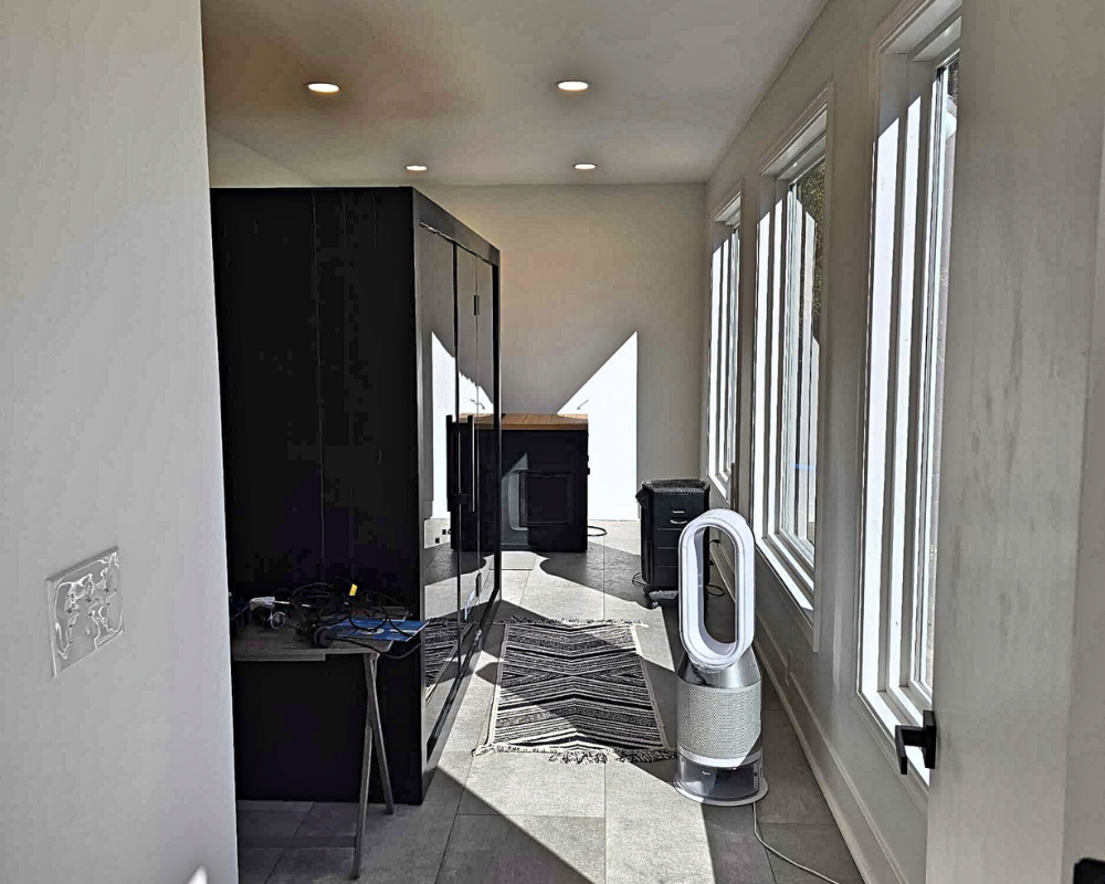 This room addition transformed an unfinished exterior space into a bright, functional retreat designed for daily wellness and comfort. What began as a simple exterior wall and bare framing evolved into a fully insulated, drywall-finished extension with expansive windows that fill the room with natural light. Large-format floor tiles create a sleek and durable foundation, while recessed lighting and clean white walls give the space a modern, airy feel. The finished room now accommodates a high-end sauna and a cold plunge setup, turning the area into a personalized home spa that blends relaxation with purpose. With thoughtful details and a seamless connection to the existing home, this addition elevates the property with a space that is both peaceful and beautifully crafted.